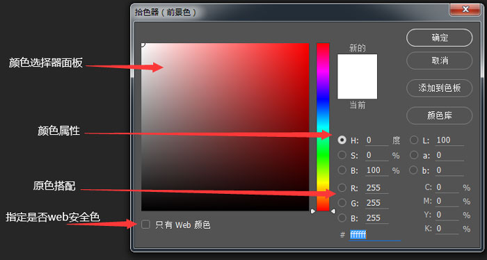 在使用Photoshop的取色时,可以通过设置R、G、B不同的比值和颜色的基本属性来得到自己想要的颜色,Photoshop取色器如下图。
